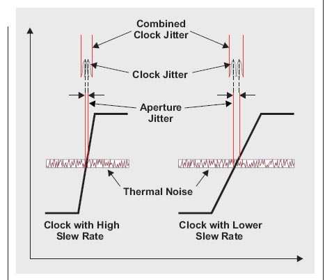 我們在產(chǎn)品說明書中可以找到ADC 的孔徑口抖動(aperture jitter)。這一值一般與時鐘振幅或轉(zhuǎn)換速率一起指定,記住這一點(diǎn)很重要。低時鐘振幅帶來低轉(zhuǎn)換速率,從而增加窗口抖動。