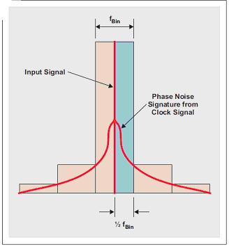 在采樣過程中,輸入信號與采樣時鐘信號混頻在一起,包括其相位噪聲。當(dāng)進(jìn)行輸入信號FFT 分析時,主FFT 容器(bin)集中于輸入信號。采樣信號周圍的相位噪聲(來自時鐘或輸入信號)決定了鄰近主容器的一些容器的振幅,如圖7 所示。因此,小于1/2 容器尺寸的偏頻的所有相位噪聲都集中于輸入信號容器中,且未增加噪聲。因此,相位噪聲整合帶寬下限應(yīng)設(shè)定為1/2 FFT 容器尺寸。FFT 容器尺寸計(jì)算方法如下: