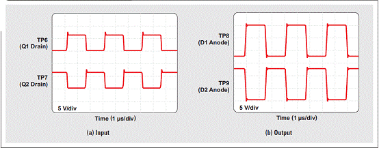 隔離變壓器 (T1) 擁有 2:1 的次級對初級匝數比、0.9 mH 的初級線圈電感,以及 3kV 的保證隔離電壓。圖 4 顯示了變壓器的輸入和輸出波形。
