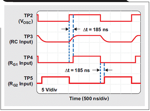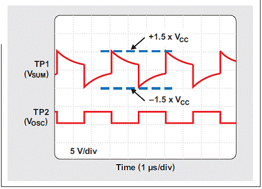 著名的三反相門振蕩器由 U1a、U2a 和 U2b 組成,選擇它是因為它在供電波動方面較為穩定。通過一個 100-pF 陶瓷電容器(COSC)和兩個 10-kΩ 電阻器(ROSC1 和 ROSC2),它的正常頻率被設定為 330kHz。在 3.0-V 到 3.6-V 電源電壓波動范圍內,振蕩器擁有接近 50% 的占空比,以及低于 ±1.5% 的較大頻率波動。圖 2 顯示了 ROSC1 和 ROSC2 (TP1) 相加點和振蕩器輸出 (TP2) 處的波形。所有電壓均為參考電路基準電壓測得。