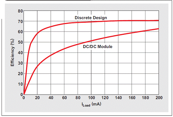 圖 5 顯示了 4.93 V 輸出電壓條件下圖 1 所示電路的紋波,而圖 6 將該電路的效率同具有穩定輸出的集成 DC/DC 組件進行了對比。