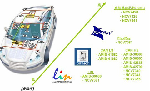 復(fù)雜度從低到高,安森美半導(dǎo)體為LIN、CAN、FlexRay等不同的車載網(wǎng)絡(luò)提供多種方案,如圖2所示。