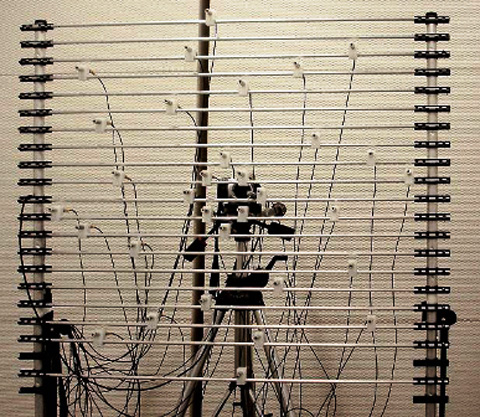 我們搭建了波束成形器,或稱為“聲學相機” ,其構造是一個32個麥克風組成的螺旋陣列,麥克風間的較大直徑距離為1米,可用來捕捉噪聲源的視覺成像,我們還組建了一個1.1*1米的金屬網格。陣列的定位與單個麥克風在標準測試中的位置相同,距通道中心線的距離為7.5米,其中心距地面距離為1.3m,從而確保通過測試中所有的測量條件相同。