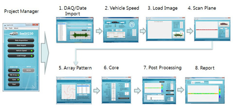 韓國鐵路研究所與SM儀器有限公司(National InstrumentsI Alliance Partner Network成員,專門從事聲音與振動相關測試應用)一起在LabVIEW環境中使用相控麥克風陣列開發了移動聲源波束成形系統,并使用該系統來實現正常運行的整列火車上的噪聲源的可視化。該測試主要是為了對兩種不同型號的列車噪聲進行對比:一種是KTX-1,由TGV Réseau型演化而來,2004年起投入使用;另一種是新型的KTX-Sancheon(KTX-II),這是由韓國開發研制的商用高速列車。