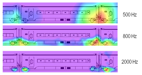 在高頻部分,車輪形成的噪聲源相當明顯。這里顯示了每一個車輪都有不同的噪聲幅度。因此,該技術極有可能用以監測車輪的工作狀態,便于維護。