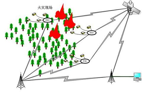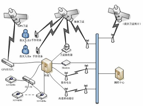 系統在火災救援中的應用示意圖,如圖下所示。手持設備1與設備2之間通過衛星通訊或電臺將災害情況向后方測控中心發送,并且通過研祥終端與終端之間數據也進行交換。較后由后方測控中心統一做出救災計劃,協調各救災資源。