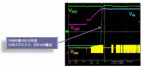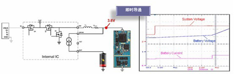 NCP185x系列就應用了這樣的即時導通系統技術,由于器件內集成的電流源可為電池充電,即使電池電壓非常低,當用戶插入電源適配器時,也可使系統電壓保持在3.6V,讓系統立即開啟,無需等待;另外,內部集成的一個5 V升壓器支持USB On-The-Go(OTG)反向供電,或用于HDMI接口的DDC電壓供電,可以一邊安全地給電池充電,一邊單獨為系統供電,如圖3所示。當電池電壓達到3.4 V時預充電結束,外部充電MOS管導通,系統電壓跟隨電池電壓。傳統充電器在電池電量低時,電池需要預充電一段時間,等待電池電壓恢復到較低電壓以上才能開機