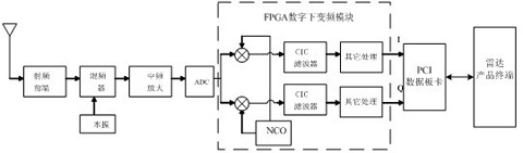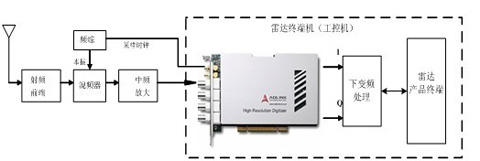 通過上節的建模、仿真、驗證,可以看出系統可將PCI-9846H運用與雷達系統中,系統構架框圖如圖4所示。直接將板卡插入雷達終端機中,將雷達中頻信號、來自頻綜的相參時鐘信號以及其他觸發信號接入板卡相關接口。系統簡化了以往數字中頻接收機,省去了外部電源、節約了外部空間以及其他數據連接等考慮。系統直接將PCI-9846H來的數據通過PCI訪問進行變頻、產品顯示。
