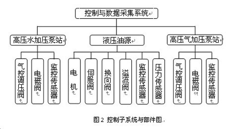 控制與數據采集系統需要監視液壓油源、高壓水加壓泵站和高壓氣加壓泵站三者的工作狀態,控制試樣所受軸向載荷、側向彎曲、內壓及外壓的大小和加載速率。系統需要控制的子系統和部件如圖2所示。