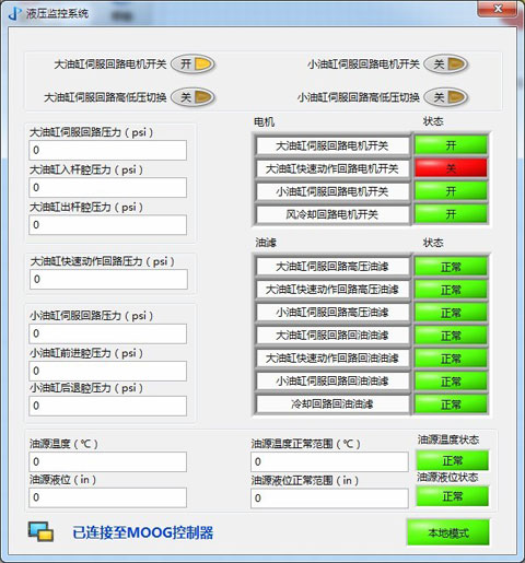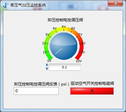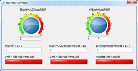 試驗參數配置完成后,點擊軟件主界面上的“開始”按鈕,此時彈出窗口,要求操作人員輸入存盤路徑和文件名,保存數據文件和配置文件,便于數據回放和下次調用。開始試驗后,彈出液壓系統、高壓水加壓系統、高壓氣加壓系統監控界面,如圖6至圖8所示。界面上包含所有執行元件的啟停開關與工作狀態,以及監控傳感器的反饋值,替代了硬件指示燈、按鈕以及傳統的二次儀表。