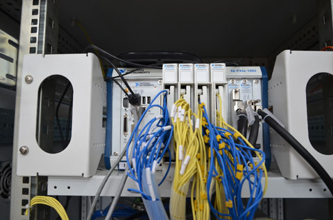 考慮到上述因素,在系統搭建中采用基于NI PXI-E平臺的集中式控制與數據采集方式。將控制與數據采集系統的所有硬件安裝在一臺現場主控制柜中。控制柜位于試驗地坑角落中,距離試樣8米左右。主控制柜中的PXIe-1082 8槽3U機箱通過PXIe-8375x4和PCIe-8375x4 MIX卡連接30米光纖與控制室內的工業控制計算機通訊,實現遠程操控。這種架構方式有以下三個優點: