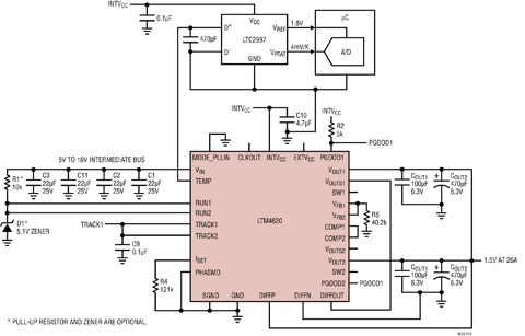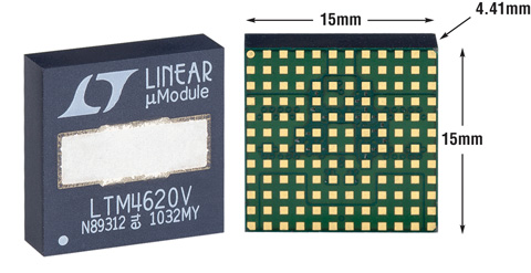 LTM4620 µModule穩壓器為高密度電源解決方案提供了一種新概念。這款高性能穩壓器裝在一個進行了卓越的熱設計的封裝中,使大功率設計能在非常小的外形尺寸內實現。具備準確均流的多相定時功能實現了 25 A、50 A 和超過 100 A 的可擴展設計。LTM4620 獨特的熱特性在環境溫度逐漸上升時,允許全功率工作。在實現大電流設計的同時,還可以將功率損耗和溫度控制在可接受的水平。