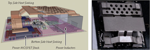 圖 3 顯示了一個尚未模制的 LTM4620 之染色側視圖和頂視圖。封裝設計由熱傳導性很高的 BT 襯底和足夠的銅箔層組成,以提高電流承載能力并實現至系統電路板的低熱阻。一種專有引線框架功率 MOSFET 棧用來提供高功率密度、低互連電阻、以及給器件的頂部和底部提供很高的熱傳導性。專有散熱器設計連接到功率 MOSFET 棧和功率電感器上,以提供有效的頂部散熱?梢栽陧敳康穆懵督饘倜嫔霞由弦粋外部散熱器,以利用空氣流動去除熱量。由于該專有散熱器的構造和模制封裝,僅有氣流而沒有散熱器就可去除頂部的熱量。