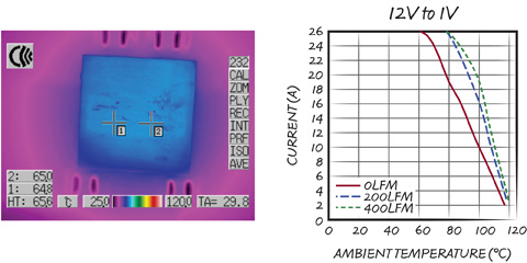 圖 4 顯示了 LTM4620 的熱像以及在 26A 設計時 12V 至 1V 的降額曲線。當具有 200LFM 氣流時,溫升僅為 35°C (在環境溫度以上),而且降額曲線顯示:一直到大約 80°C 時較大負載電流都無需降額。圖 4 顯示了熱量數據,這些數據顯示了耐熱增強型高密度電源穩壓器解決方案的真正優點。獨特的封裝設計在小尺寸中盡可能減少功率損耗,并有效地去除了作為功率損耗函數的熱量。