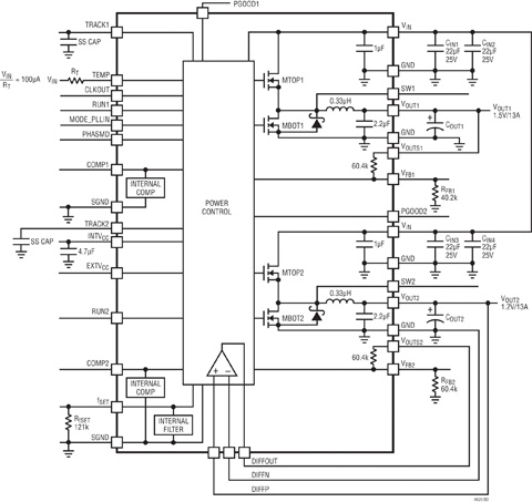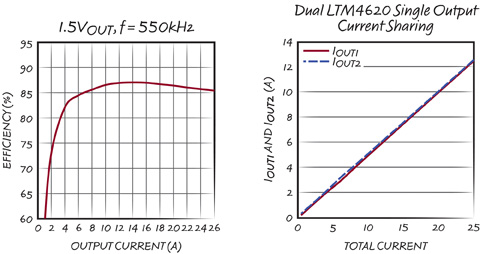 圖 5 顯示以雙輸出均流模式工作的 LTM4620。這種配置提供密度非常高的 1.5V/26A 解決方案。RUN、TRACK、COMP、VFB、PGOOD 和 VOUT 引腳連接在一起,以實現并聯工作。該設計顯示了一種利用一個 LTC2997 溫度傳感器監視器監視 LTM4620 內部溫度二極管的方式。溫度采樣二極管可由很多不同的器件監視,這些器件監視一個連接二極管的晶體管。圖 6 顯示兩相并聯輸出、1.5V 時的效率和兩通道均流性能。就如此高密度的解決方案而言,86% 的效率是相當好的,而且正如圖 4 的熱量數據所示,由于電路板安裝后的低 ӨJA 熱阻,溫度上升得到了良好控制。有效的頂部和底部散熱系統使 LTM4620 能以很少的溫度上升及滿功率工作。圖 6 顯示了VOUT1 和 VOUT2 的均流性能。LTM4620 的內部控制器經過了準確微調和測試,以實現輸出均流。這使 LTM4620 成為高密度、可擴展電源解決方案的卓越選擇。高效率和快速瞬態響應電流模式架構很好地滿足了高性能處理器、FPGA 和定制 ASIC 所需的低壓內核電源要求。出色的輸出電壓初始準確度和差分遠端采樣在負載點提供適當的 DC 電壓調節。獨特的熱量控制能力和卓越的均流允許將輸出電流能力擴展至高達超過 100A。為每個穩壓器通道設定多相工作無需外部相移時鐘源。每個 LTM4620 具有一個“時鐘輸入”引腳和一個“時鐘輸出”引腳,以及用于對并聯通道進行定時的內部可編程相移功能。可以選擇外部頻率同步或內部內置定時。這些定時功能進一步實現了功率調整概念。