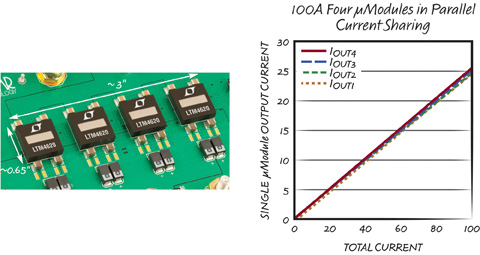 圖 7 顯示了 8 相、4 個 µModule 穩壓器 100A 設計圖片以及所有 4 個穩壓器的均流圖。所有 8 個相位是定時相位,并連接到一起以實現可擴展至 100A 的均流方案。正如圖 7 注釋所示,要支持 100A 的電源解決方案,實際的 µModule 穩壓器占用的電路板空間大約為 1.95 平方英寸。這就為這類大電流提供了卓越的高密度電源解決方案。一個散熱器可以運用到所有 4 個模塊上,以通過空氣流動去除電源損耗。這可防止大量電源損耗消散到系統電路板中。