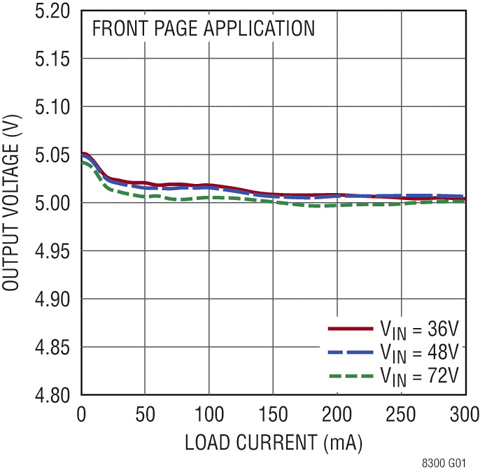 以邊界模式工作時,負(fù)載調(diào)節(jié)非常好,因為反射的輸出電壓始終在二極管電流過零時采樣。LT8300 一般提供好于 ±2% 的負(fù)載調(diào)節(jié),如圖 4 所示。