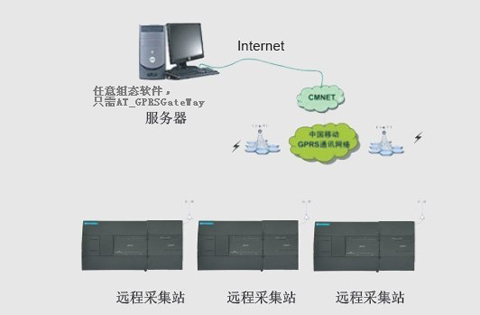 本系統(tǒng)由LE5404通訊模塊、天線和GPRS通訊網(wǎng)關(guān)軟件AT_GPRSGateWay等組成,實(shí)現(xiàn)LE PLC的GPRS(GSM移動(dòng)無線網(wǎng)絡(luò))無線連接。該系統(tǒng)中GPRS模塊配置簡(jiǎn)便,無需第三方組態(tài)軟件的專用驅(qū)動(dòng)程序,可透明提供遠(yuǎn)程站的所有過程數(shù)據(jù),并可在中央站進(jìn)行分析。