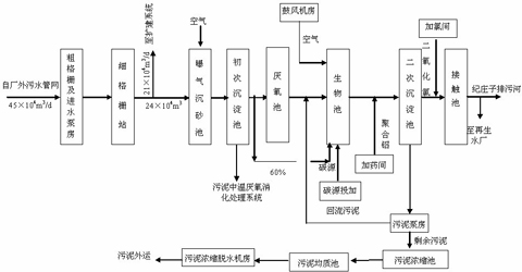 本工程建設內容為改造老系統曝氣沉砂池1座,改造老系統初次沉淀池集配水井2座,改造老系統初次沉淀池2座,改造老系統初次沉淀池為2座厭氧池、改造老系統生物池4座、改造老系統污泥泵房2座、新建老系統接觸池1座、改造老系統加氯間1座、改造擴建系統初次沉淀池1座為厭氧池、改造擴建系統生物池4座、新建擴建系統接觸池1座、改造擴建系統污泥泵房1座;新建加藥及碳源投加間1座、新增除臭系統,以上建設內容全部引入自控系統。污水、污泥處理工藝流程如下圖所示: