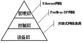 天津紀莊子污水處理廠自動控制系統提供了簡明的、高效的﹑開放的網絡體系結構,將以前設備控制的五層通訊結構簡化為三層:管理層﹑控制層和設備層。管理層網絡采用Ethernet網絡;控制層網絡采用Profibus-DP網絡;設備層可選擇多種網絡:串行總線、Ethernet、Profibus-DP等。設備層通訊網絡用于實現現場設備(開關﹑儀表和人機界面等)與PLC之間的通信;控制層采用Profibus-DP網絡,主要負責各個控制器與IO模塊的通訊;上層的Ethernet網絡實現PLC之間﹑PLC與上位機以及與第三方Ethernet設備的數據通信,整個通訊形成了具有優異通信功能的三層網絡,如圖2-1所示: