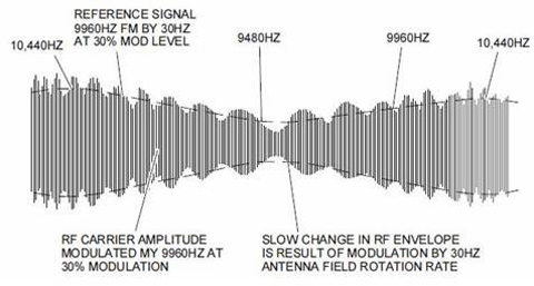 可變相位信號(Variable Phase Signal)只包含單純的射頻載波,頻率范圍108MHz~117.95MHz。兩對正交的邊帶天線分別輻射正弦調制邊帶波和余弦調制邊帶波,場強均按30Hz的規律變化,這樣在空間就生成了一個30Hz正弦規律改變的調幅波,表達式為: