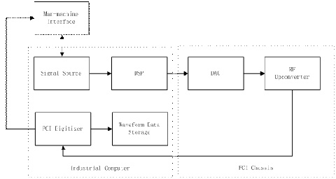 系統選用流水線形式進行連接,與信號流方向一致,具有很高的效率,時延短,處理數率高,可以一定程度上彌補GPP信號處理速度慢的不足。但是由于各模塊之間采用實際電路互聯,模塊間耦合緊密,獨立程度不高。如果系統功能改變,需要增加、去除或修改某一模塊,牽扯到相應的模塊變動,甚至總體結構的改變。因為設計目的是針對測試系統信號源的測試和校準,信號相對固定,不需要頻繁變動,所以選用流水式結構,結構框圖如圖2所示[7]。信號的產生和處理由工控機完成,任意波形發生模塊(Arbitrary Waveform Generator,AWG)實現波形輸出(高頻時需要用到數字上變頻卡),如果做無線發射和接收時需要附加天線和射頻放大器。信號的采集和數模轉換由凌華科技PCI-9846高速數字化儀完成,轉換結果可以實時顯示,也可以保存成波形文件以便后續處理。