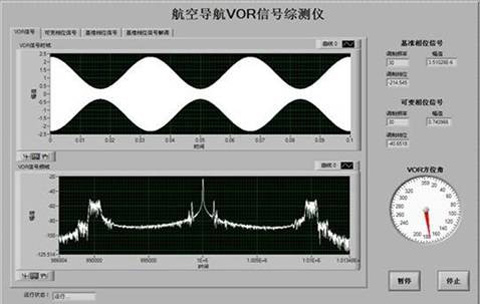 為實現對信號的測量和驗證,需要對采集的波形進行解調并還原出相應的信息。采集到的VOR空間合成信號經過相干解調后得到空間合成信號的外包絡,包括30Hz的可變相位信號,和9960Hz的調頻副載波。30Hz可變相位信號經過30Hz濾波器直接得到,前面板可見其時域、頻域波形以及頻率、相位和幅值等信息;9960Hz副載波經過濾波后鑒頻,得到30Hz基準相位信號,前面板可見其相應參數。基準相位信號與可變相位信號的相位差可指示當前的方位信息,讀書為VOR方位角。運行后的前面板如圖5所示。程序運行時,其中的各個標簽頁可以輪流顯示,按下右下方的“暫停”鈕可以鎖定當前標簽頁。