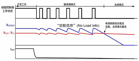 圖1是進入關閉模式的過程。當輸出電流從滿載慢慢降低時,初級控制器會從正常工作轉換成跳周期工作,輸出電壓和空載信息基本上比較接近;當輸入極低跳周期或關閉模式時,輸出空載電壓將低于輸出電壓,從而檢測到極低負載或空載,激活關閉模式。