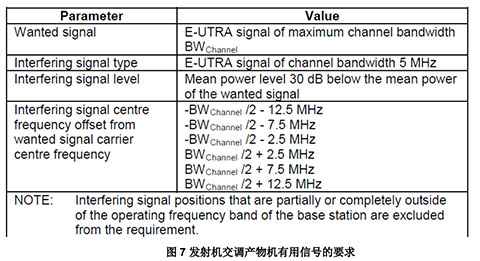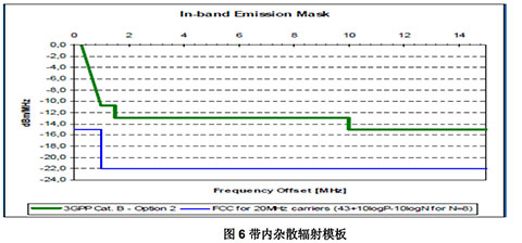 發射互調要求是用來測試發射機抑制自身非線性的能力,測試的干擾信號為 5MHz E-UTRA,均值功率為 43dBm-30dB=13dBm 的信號,其位置分別位于離主信號+/-12.5MHz,+/-7.5MH 在,+/-2.5MHz 處,其交調產物要滿足圖 6 所以的雜散輻射模板。
