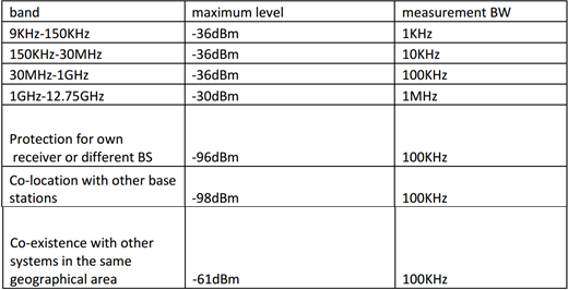 發射雜散是指 9KHz 到 12.5GHz 頻段,除去帶內雜散以外的所有頻率范圍內的雜散要求,這是一個強制的要求,如下總結了通用的雜散指標,發射通道對接收通道的雜散要求,共存雜散指標,共站址等雜散指標要求,對共存,共站址沒有列出所有的頻率范圍,僅僅列出了一些代表部分,具體的設計需要對照3GPP 里面列出的所有頻率范圍的雜散指標要求。