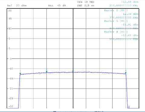 平坦度:圖 8 為 DAC34SH84+TRF3705 的平坦圖,結合頻率校準,能夠滿足平坦度要求。