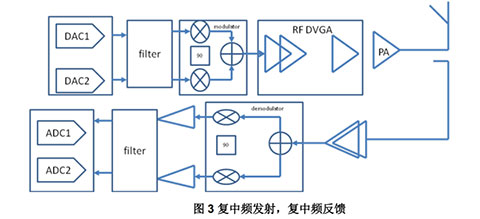 2) 對反饋通道而言,由于采用數字高中頻的方式,其本振泄露和鏡像信號都可以通過簡單的濾波器濾除,無需做任何校準;