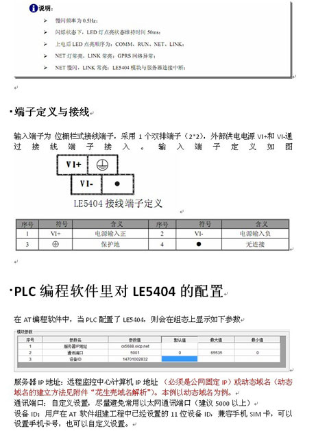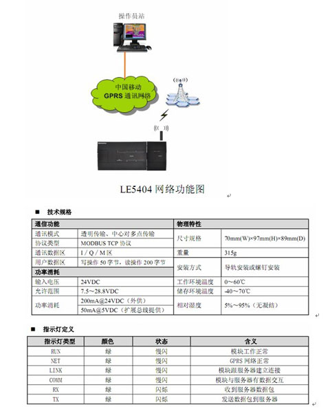 LE5404是LE系列PLC的擴(kuò)展模塊,通過(guò)GPRS無(wú)線網(wǎng)絡(luò)實(shí)現(xiàn)與Internet的對(duì)接,完成數(shù)據(jù)遠(yuǎn)程交互功能。