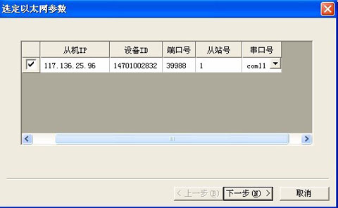注意:在“選定以太網(wǎng)參數(shù)信息”屬性頁(yè)中,勾選要連接通訊的通訊鏈路并設(shè)置從站號(hào)及串口號(hào)(串口號(hào)只能使用COM11-42的32個(gè)串口,每個(gè)串口可以對(duì)應(yīng)不超過(guò)8個(gè)設(shè)備從站)。從站號(hào)及串口號(hào)的設(shè)置要與組態(tài)軟件中的設(shè)置一致。