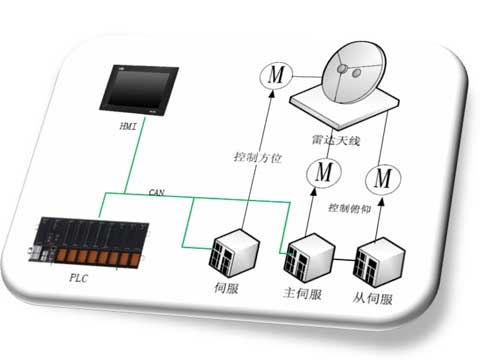 雷達(dá)天線運(yùn)動(dòng)模式分為俯仰運(yùn)動(dòng)和方位運(yùn)動(dòng)兩種,俯仰是由兩臺(tái)主從伺服減速電機(jī)帶動(dòng)兩根絲桿,再連接天線方位是一臺(tái)伺服減速電機(jī)直接連接天線。使用時(shí),俯仰先工作,把天線提升到大致80 度停下來(lái),然后方位工作,不停的掃描空中目標(biāo)。整套系統(tǒng)通過(guò)CANBUS連接,CAN總線具有實(shí)時(shí)性好,糾錯(cuò)能力強(qiáng)等特點(diǎn)。伺服控制器擁有標(biāo)準(zhǔn)CANBUS接口,通過(guò)CAN 總線連接到PLC控制器上,然后HMI通過(guò)自帶的CAN 總線對(duì)PLC進(jìn)行DI、DO、AI、AO 控制,另外,HMI還可以接受電機(jī)位置信號(hào),對(duì)PLC代碼參數(shù)進(jìn)行修改,同時(shí)顯示電機(jī)電流、溫度、轉(zhuǎn)速、限位狀態(tài)等。