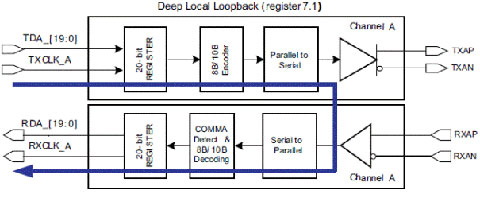 因為從一般意義上來看,系統(tǒng)排查工作存在著單步變化的要求,因此近端深度環(huán)回被設計成為如下圖所示的物理層的單個開關的連通,這樣在保證所有狀態(tài)機不變的情況下,允許系統(tǒng)將輸出的串行信號輸入到接受通路。