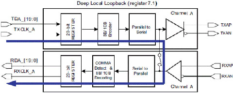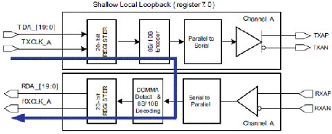 b. 近端淺度環(huán)回,從并行到并行方向,鏈路僅經過8b/10b 的編解碼機,隔離了芯片內部的串行解串的電路部分;