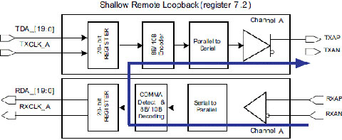 d. 遠端淺度環(huán)回,從串行到串行方向,鏈路經過了Serdes 內部,除并行FIFO 之外的所有電路部分;
