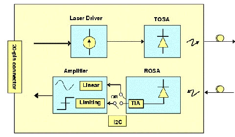 以在市場上主流的SFP+方案為例,ONET8531T,TIA,作為IV 變換級,提供了高達4.5K 的跨阻;而ONET8501PB 作為放大器,對于小信號提供了高達34dB 的增益。