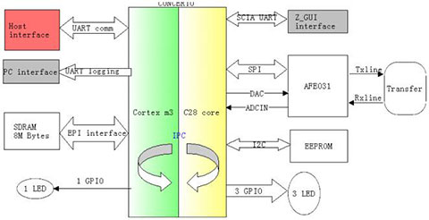 本方案采用 Concerto 系列芯片 F28M35H52C1 作為主芯片,處理 PRIME 協議的 UPPER MAC 及LOW MAC, PHY 層協議。F28M35H52C1 是一款雙核的MCU,它內部包含了Cortex m3 主系統和TI C28x 控制子系統兩個MCU 系統,每個系統分別有512KB 的Flash 空間,Cortex m3獨立使用 32KB RAM,TI C28x 獨立使用 36KB RAM,另外還有可配置使用權的 64KB 的共享RAM(在EDC 系統中全部被分配給C28x 使用)和2KB 的IPC Message RAM。在EDC 系統應用中,Cortex m3 核工作主頻為 75MHz,它負責處理 Upper MAC 協議, C28x 核工作主頻為150MHz,它負責處理 Low MAC 及 PHY 層協議,兩個核之間通過 IPC 內部數據共享區機制進行通信。主芯片 MCU 外加一個 8M Bytes 的 SDRAM,由 CM3 核進行訪問,用來存儲節點信息數據庫等數據,目前系統使用的大小約為3M Bytes;另外有一個128KByts 的EEPROM,由C28x訪問,用來存儲系統掉電參數;模擬前端采用 TI AFE031,支持三相和單相連接,由 C28x 核通過SPI 接口對其進行控制。系統框圖如圖1 所示。其中,CM3 通過1 個GPIO 口控制一個LED,在系統正常工作時以 1Hz 頻率進行顯示;C28x 通過 3 個 GPIO 控制另外三個 LED,分別指示C28x 工作狀態及PLC 通信狀態。