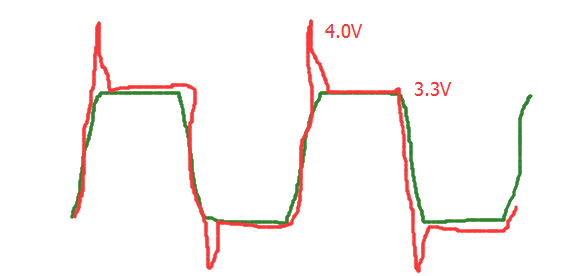 亮線的問題除了跟數(shù)據(jù)有關(guān),也跟時(shí)鐘有關(guān),PCLK的電流設(shè)置到16mA,帶來增加驅(qū)動(dòng)能力的好處,同時(shí)也會(huì)增大電平翻轉(zhuǎn)的過沖。如下圖所示,綠色的方波是我們想要的較佳波形,紅色波形卻是實(shí)際的情況,拿張M5的電路,示波器測試一下即可驗(yàn)證。