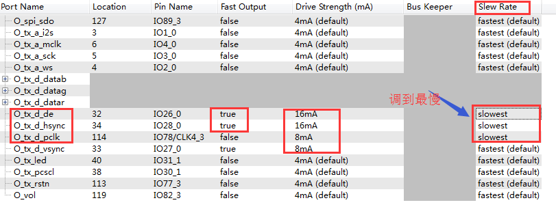 先從第一個(gè)解決方案著手,在primace7.2下把默認(rèn)的HS,VS輸出4mA(default)改為8mA,對翻轉(zhuǎn)速度比較快的PCLK改為16mA。而輸入全部加拉弱上拉,改了以后僅對黃色灰階有改善(看不出亮線),其它的并沒有改進(jìn)行。