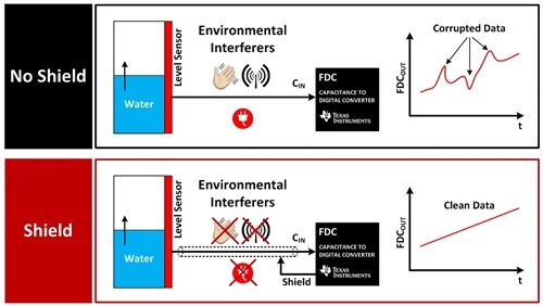 想象一下有一條導線被連接至FDC1004通道輸入中的一個。當你的手靠近這條導線并且將要接觸到它時,手與導線上的信號就形成了一個閉合回路,此時人體起到了接地源的作用。如果你的手不是既定目標,那么就被視為寄生電容。解決方案是設置包裹在導線外的有源屏蔽。屏蔽驅動器是在同一電壓電位,即相同波形上驅動為傳感器輸入的有源信號輸出,所以沒有電位差,因此在屏蔽和傳感器輸入之間就沒有電容。任何外部干擾將把具有較小交互作用的屏蔽信號與傳感器信號耦合在一起。圖1顯示的就是屏蔽傳感器到FDC1004的信號線路的做法是如何減少任何干擾源對電容測量值的影響程度的。