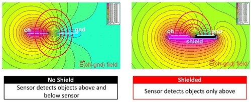 在沒有屏蔽時,傳感器即CH檢測的是傳感器上方和下方的物體。根據應用的不同,同時檢測上方和下方的物體是不合適的,還會錯誤地表示與目標相關的電容測量值。通過在CH和GND電極下方放置一個屏蔽傳感器,下方的場線從根本上被阻斷了;只有頂部的場線具有一個已確定的路徑。圖2中顯示的示例有些許簡化,并且不包括邊緣效應。