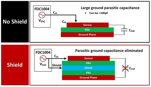 除了將初始寄生電容偏移引入到測量值中,溫度也是導致寄生接地層電容發生變化的因素。這一現象可以看成一個隨時間發生變化的偏移。這些溫度造成的變化由接地層的膨脹和收縮所導致。在傳感器和接地層之間插入一個屏蔽層有助于緩解寄生接地層電容對測量值的影響。
