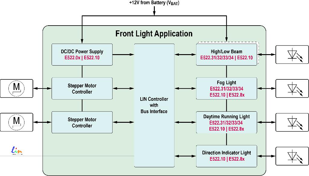 例如E522.80/81/82/83系列線性控制器可以作為電源集成電路型控制器控制如轉向燈,尾燈等工作電流和功率比較小的LED燈,即,工作電流大約在大于40mA且小于70mA這個范圍之內的LED燈。