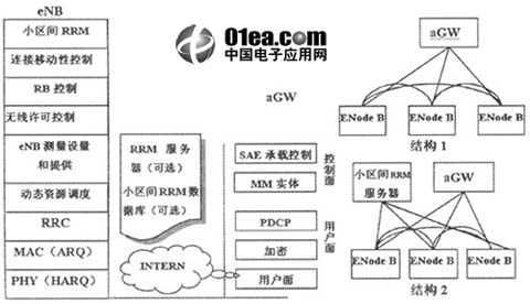 3GPP初步確定LTE的架構如圖1所示,也叫演進型UTRAN結構(E-UTRAN)[3]。接入網主要由演進型Node B(eNB)和接入網關(aGW)兩部分構成。aGW是一個邊界節點,若將其視為核心網的一部分,則接入網主要由eNB一層構成。eNB不僅具有原來Node B的功能外,還能完成原來RNC的大部分功能,包括物理層、MAC層、RRC、調度、接入控制、承載控制、接入移動性管理和Inter-cellRRM 等。Node B和Node B之間將采用網格(Mesh)方式直接互連,這也是對原有UTRAN結構的重大修改。