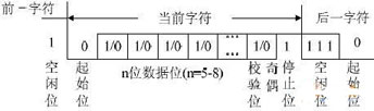 由于計算機內部處理信息的方式為并行數據處理,而串行外設接收或發送的信息是串行的,因此串行接口對于輸入來說必須完成由外設到主機的串行信號的格式轉換;對于輸出而言,又必須進行并行到串行格式轉換。串行異步通信有一定的傳輸規范或稱作異步通信協議。它包括兩方面的內容:一是字符的傳送格式的規定,二是數據傳送速率的要求。異步通信的字符格式如圖2。