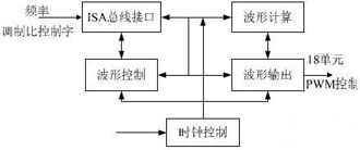板上采用的芯片是ALTERA 公司的FLEK-10K 系列芯片。嵌入式陣列由一系列的EABs(Embedded Array Block——嵌入式陣列塊)組成。當使用EAB 來實現邏輯的時候,每一個EAB 可以提供100~600 個門來實現復雜的邏輯處理。波形卡與工控機通過ISA 槽連接,以工控機傳遞的波形控制字為計算的輸入信號,經如圖3 的計算處理后,輸出18 個功率單元的PWM 控制信號。