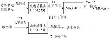 上傳信號是從功率單元和測量單元以光信號傳輸的串行格式數據,在光電轉換板上要實現的是將光信號轉換成RS232 標準電平信號。下傳信號是從波形卡發出的是直接控制功率器件通斷的TTL 電平信號,經光電板轉換成光信號,由光纖發送到功率單元,功率單元再將光信號轉換為觸發脈沖信號。光電板上的信號轉換如圖4 所示: